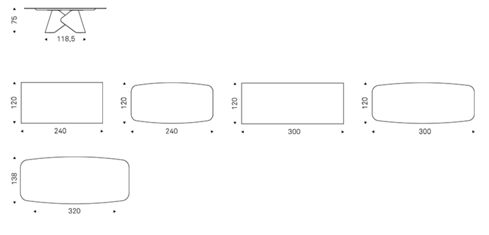 Abmessungen: 240x120x75h; 240x120x75h shaped; 300x120x75h; 300x120x75h shaped; 320x138x75h shaped.